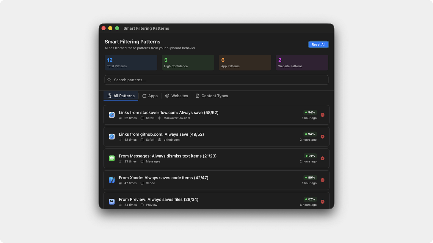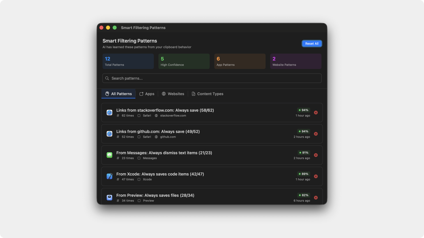 Quip quietly learns from your behavior — which apps, sites, or item types you tend to keep, and which you always dismiss. Once it is certain about a behavior, it will automatically filter out items. The new Manage Patterns screen shows you what rules it has learned, and lets you reset or tweak them at any time. This feature replaces Contextual Learning from Quip Super Intelligence on macOS 26.