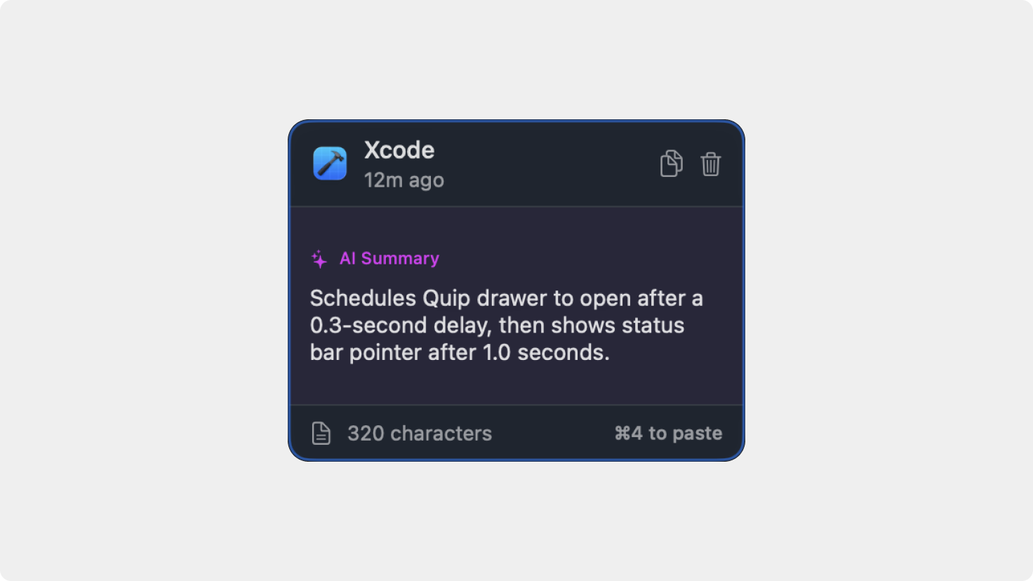 When you copy a long block of text — think a 5-paragraph email or meeting notes — Quip can use Apple Intelligence to automatically generate a one-sentence or bulleted summary. This summary shows up and fits in your history list, so you can scan it instantly without opening the full item.