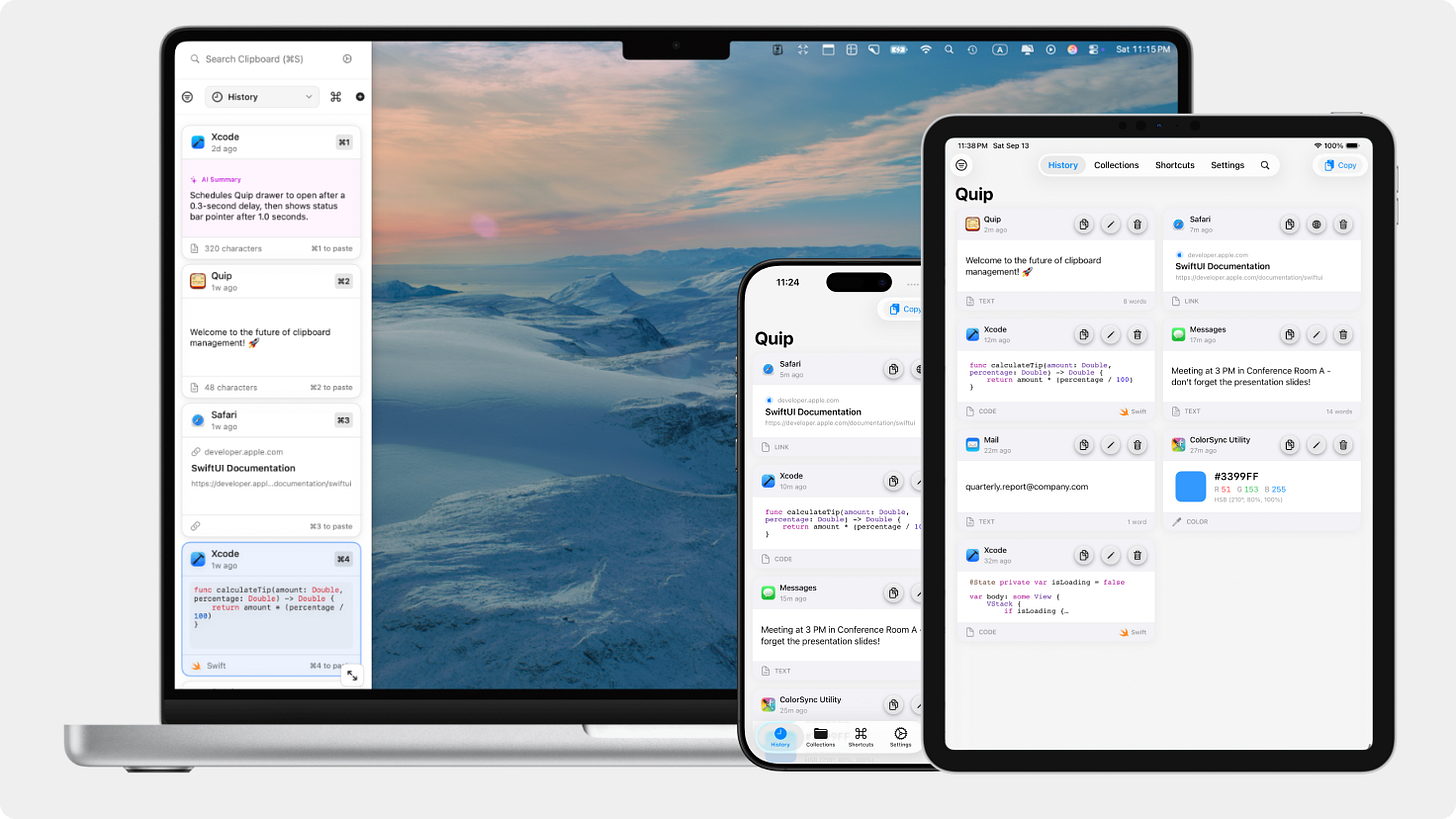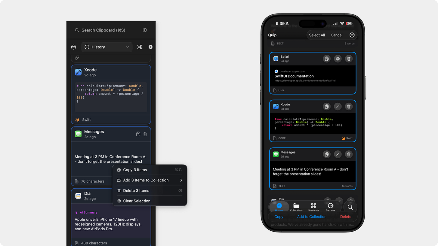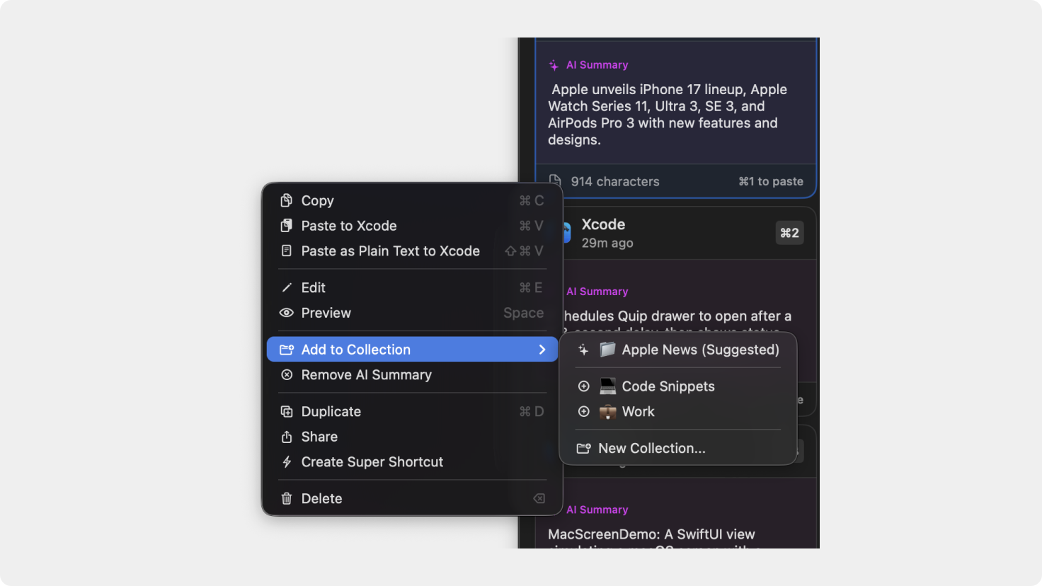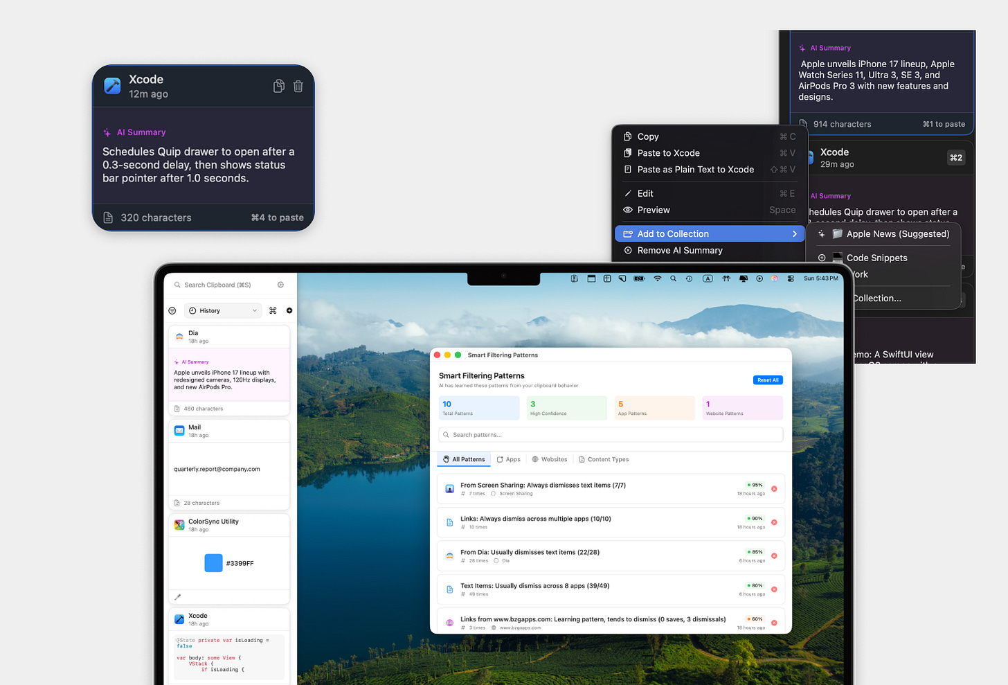 We’re excited to share Quip 1.4 — our biggest update yet. With the arrival of Apple Intelligence on macOS 26, Quip now goes beyond being a faster, cleaner clipboard manager and becomes something entirely new: an intelligent assistant for your everyday workflow. Quip can now summarize long text items, suggest collections automatically, and learn what you do (and don’t) want in your history, and let you manage what it’s learned — all on-device, privately, and under your control.